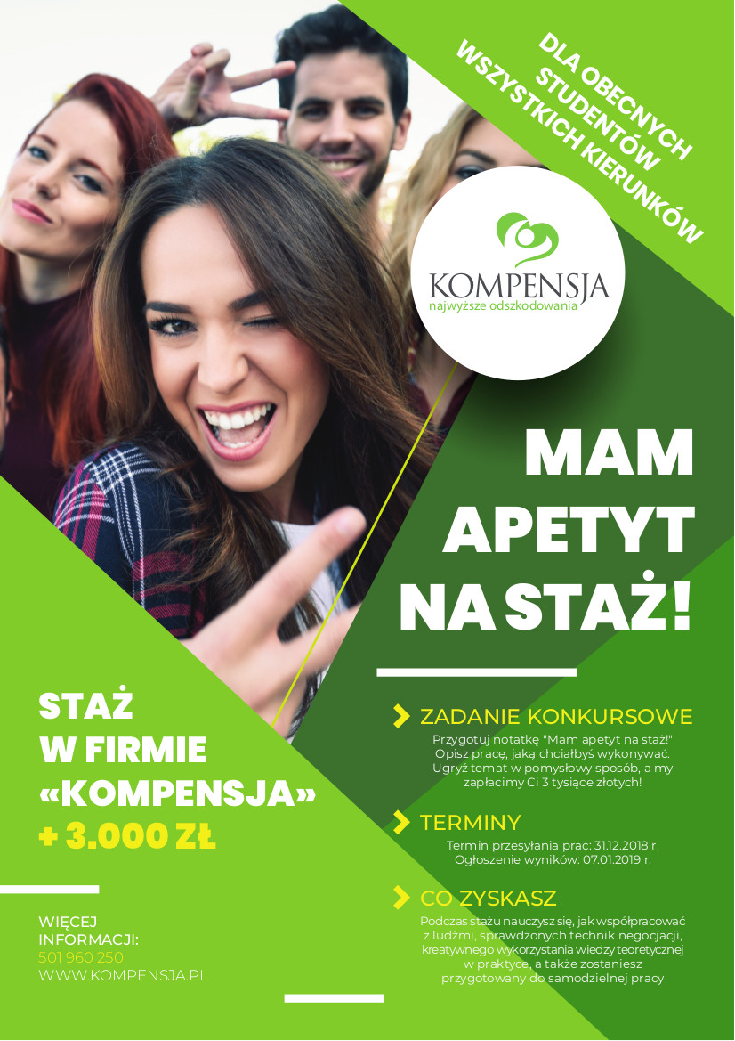 Więcej informacji w regulaminie stażu: https://www.kompensja.pl/regulamin-konkursu.pdf