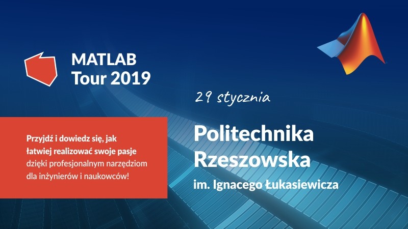 Zapraszamy pracowników uczelni oraz studentów na seminarium w ramach „MATLAB Tour 2019”. Spotkanie odbędzie się 29 stycznia w godz. 11.00-15.00 w Sali A-101 Rady Wydziału Elektrotechniki i Informatyki Politechniki Rzeszowskiej.