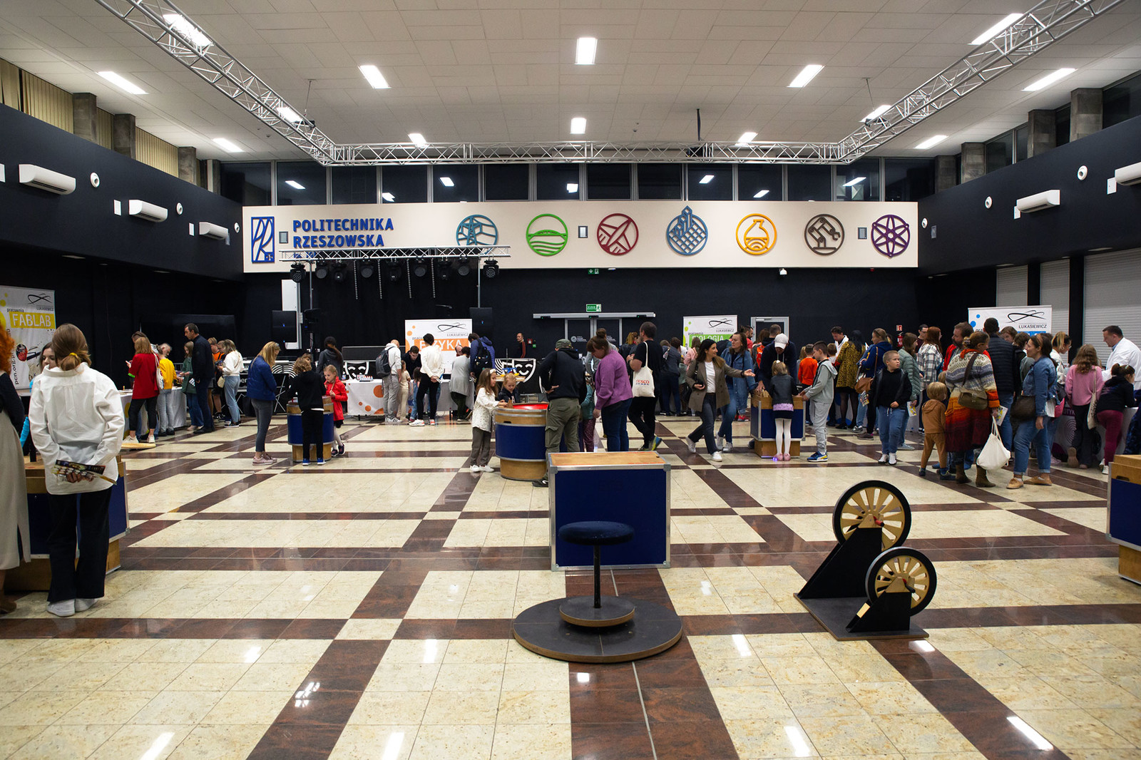 Zwiedzenie warto było rozpocząć od budynku V, gdzie poza strefą pokazową i wystawienniczą z mnóstwem atrakcji znajdował się punkt informacyjny, w którym najmłodsi otrzymywali ulotkę, aby móc wziąć udział w zabawie polegającej na zebraniu ośmiu naklejek ukrytych na wydziałach uczelni. Komplet naklejek można było na koniec wymienić na okolicznościowy dyplom i upominek. Ponieważ teren Politechniki Rzeszowskiej jest rozległy, organizatorzy przygotowali przewodnik i interaktywną mapę uczelni w Google Maps, aby ułatwić uczestnikom poruszanie się po budynkach.