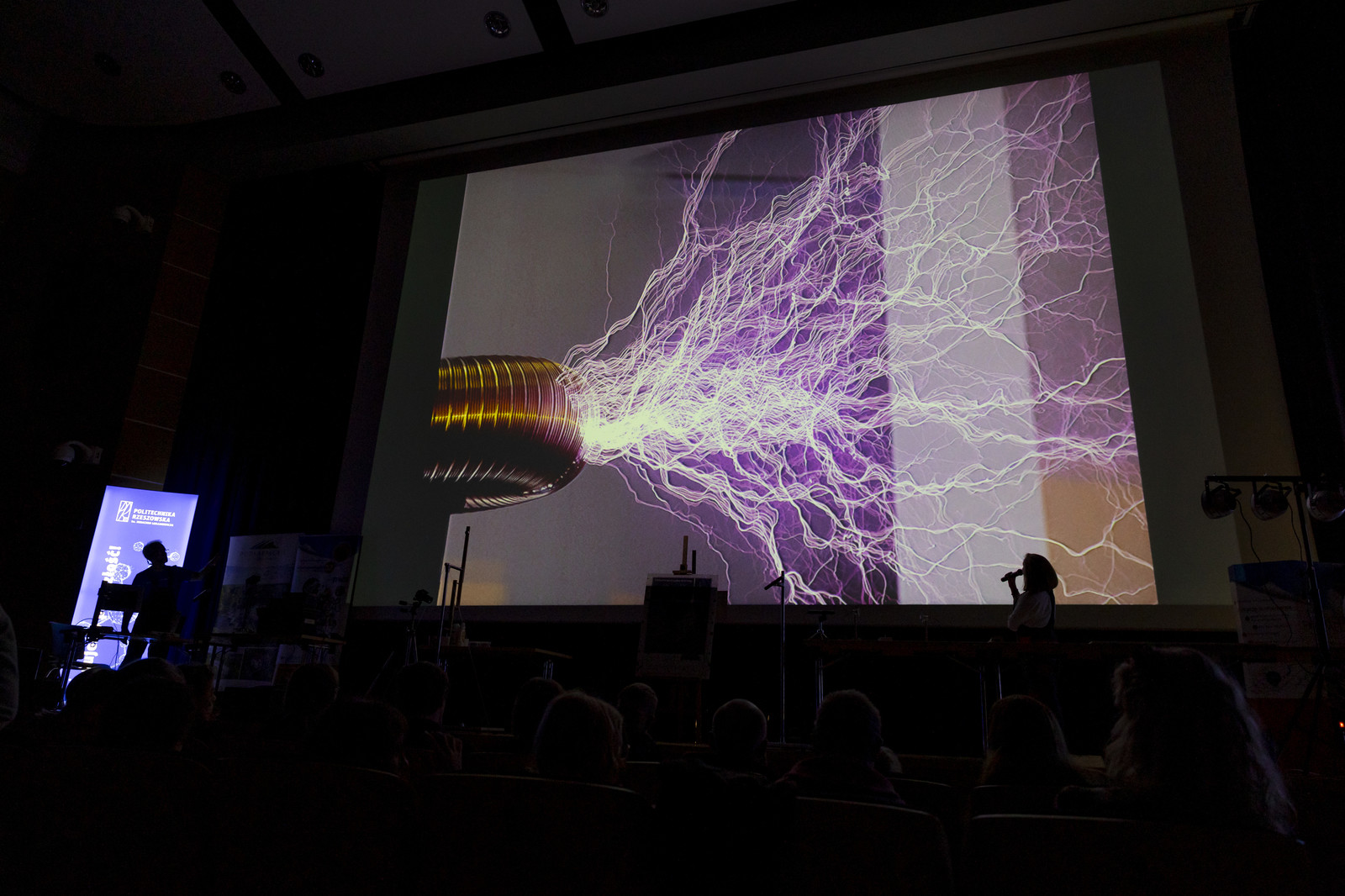 Najbardziej wyczekiwaną atrakcją Nocnych Spotkań z Nauką był „Teatr wysokich napięć”. Do tego widowiskowego spektaklu wykorzystany został jeden z największych w swojej klasie transformatorów Tesli. Kilkumetrowe wyładowania, które w rytm muzyki rozświetlały mrok, wzbudziły zachwyt widowni.