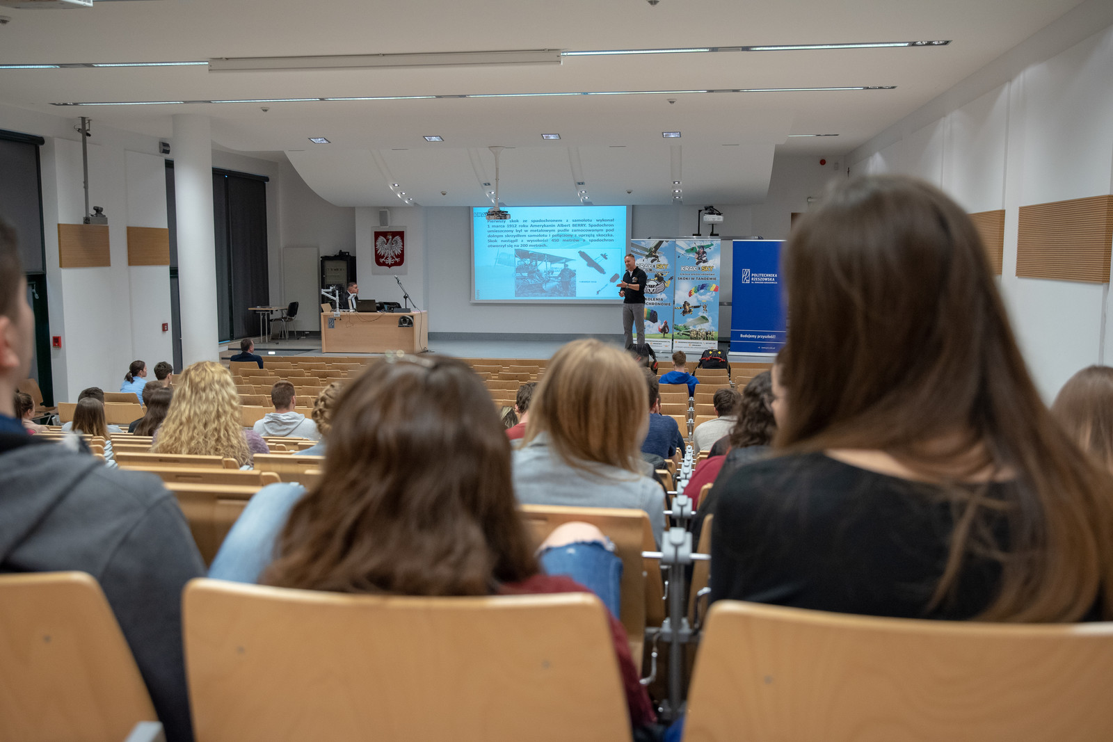 10 kwietnia na Politechnice Rzeszowskiej odbył się pokaz szkolenia spadochronowego i wykład "Historia spadochroniarstwa na przełomie wieków oraz wykorzystanie polskich wojsk powietrznodesantowych podczas II Wojny Światowej". Organizatorem wydarzenia była szkoła spadochronowa KrakSky.