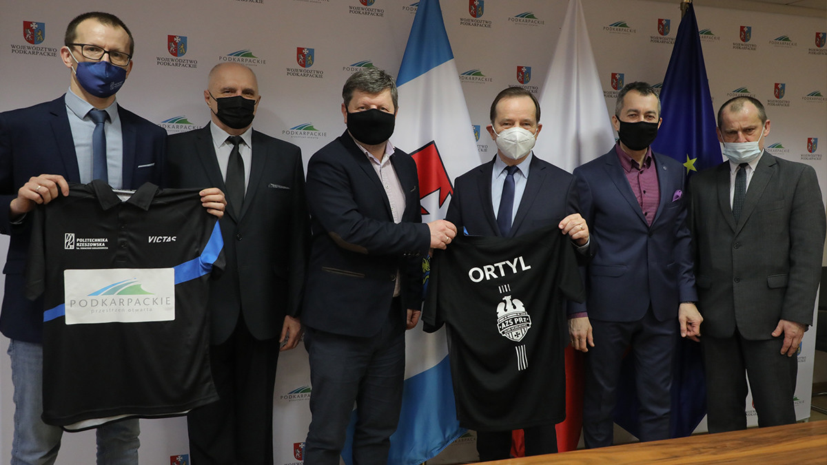 W spotkaniu uczestniczyli: marszałek województwa podkarpackiego Władysław Ortyl, rektor Politechniki Rzeszowskiej prof. dr hab. inż. Piotr Koszelnik, prorektor ds. studenckich prof. dr hab. Grzegorz Ostasz, dyrektor Centrum Sportu Akademickiego PRz Jerzy Pająk oraz jego zastępca Grzegorz Sowa.